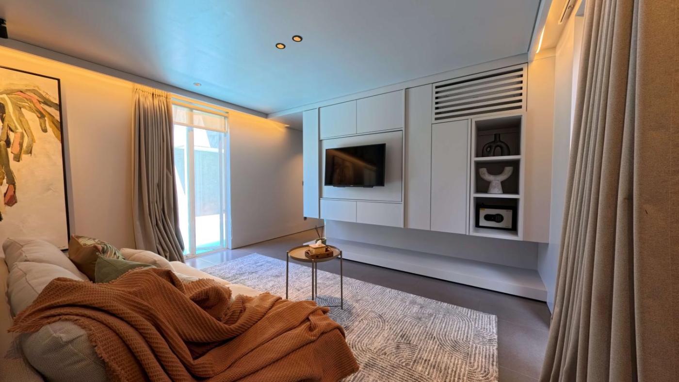Three-Bedroom Villa. This villas standout feature is the pool with a view. Boasting a private entrance, this air-conditioned villa includes 1 living room, 3 separate bedrooms and 3 bathrooms with a walk-in shower and a bath. Guests can make meals in the kitchen that is fitted with a refrigerator, a dishwasher, an oven and a microwave. The spacious villa offers a washing machine, a tea and coffee maker, a seating area, a flat-screen TV with streaming services, as well as garden views. The unit has 4 beds.