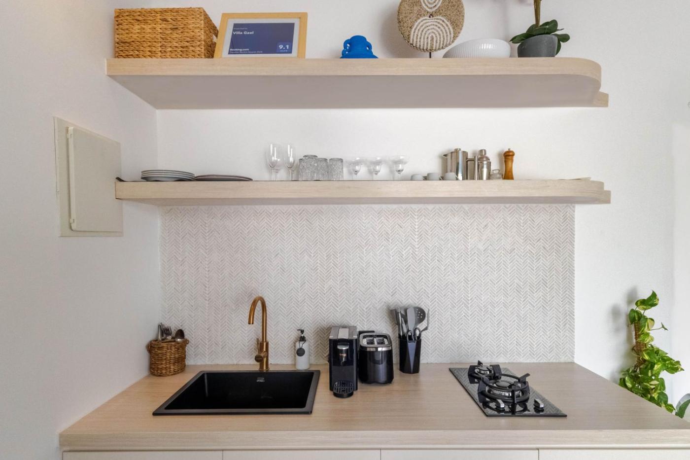 The air-conditioned villa is composed of 1 separate bedroom, a living room, a fully equipped kitchen with kitchenware, and 1 bathroom.